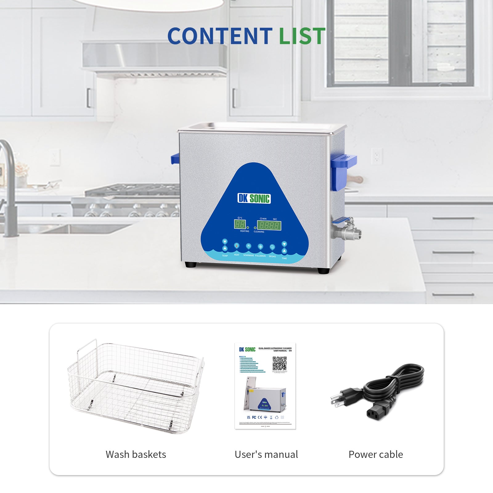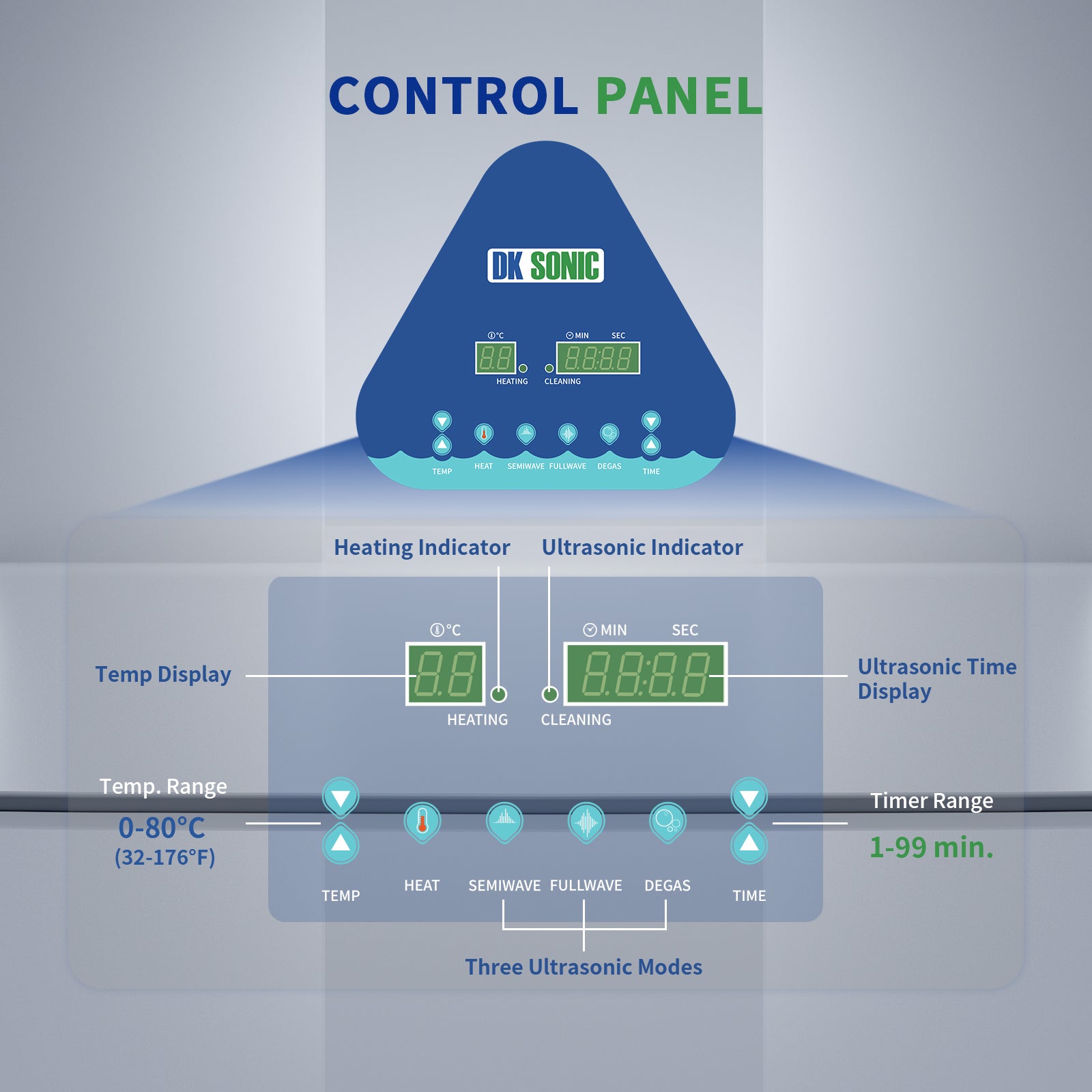FULLWAVE mode(40KHz) for intensive rinse of blind holes or complicated surfaces; SEMIWAVE mode (semiwave based on 40KHz, i.e. 33KHz) for rough surface cleaning; DEGAS mode for removing ultrasonic fatigue so as to improve cleaning effect;