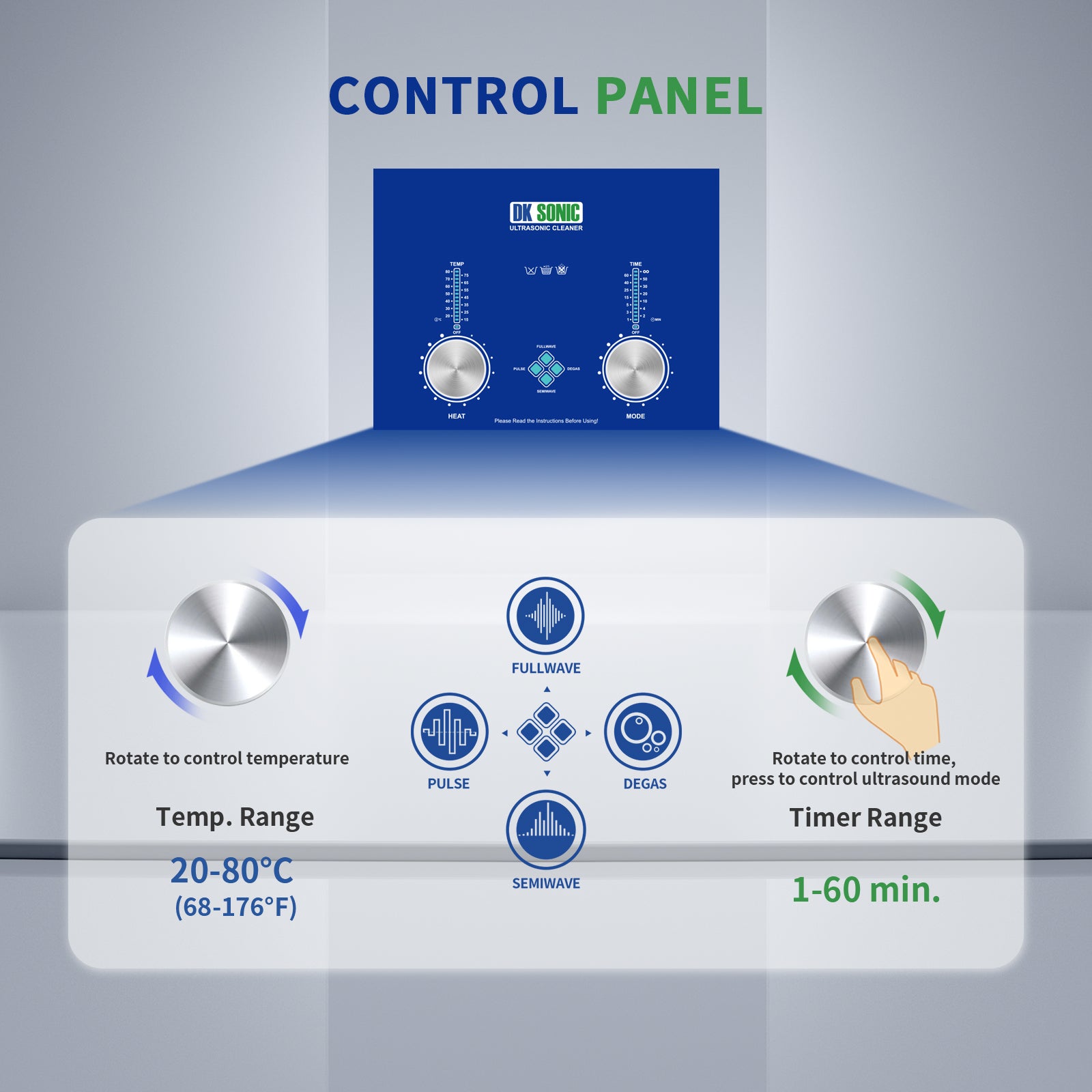 FULLWAVE mode(40KHz) for intensive rinse of blind holes or complicated surfaces; SEMIWAVE mode (semiwave based on 40KHz, i.e. 33KHz) for rough surface cleaning; DEGAS mode for removing ultrasonic fatigue so as to improve cleaning effect; PULSE mode for dynamic rinse of stubborn stains